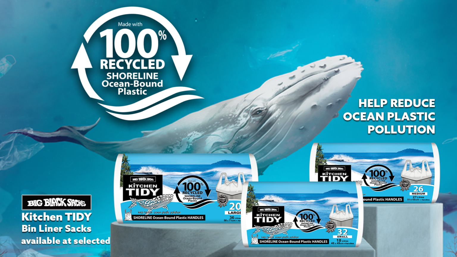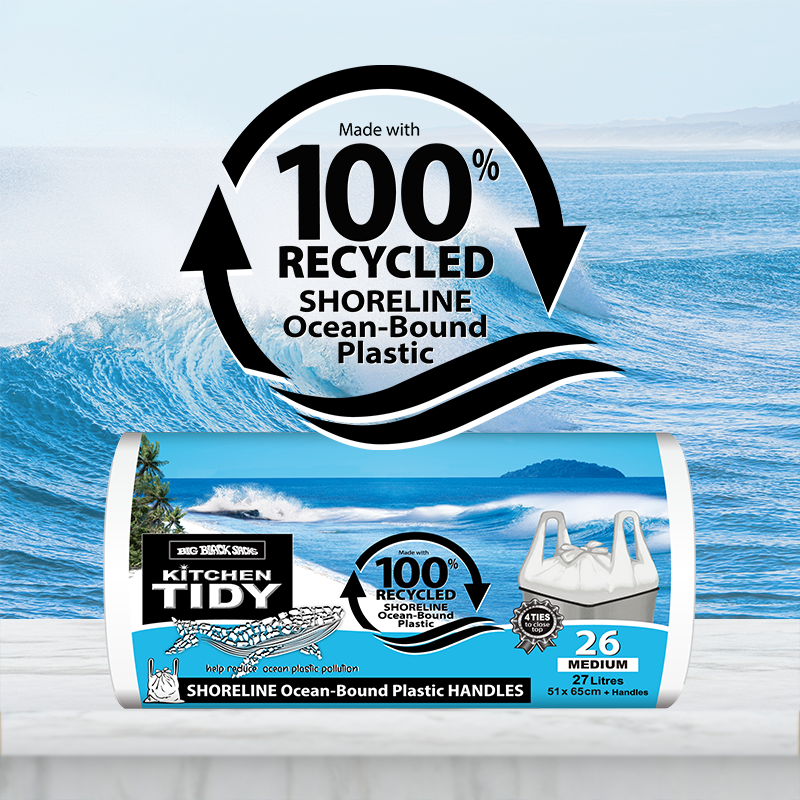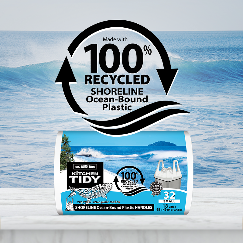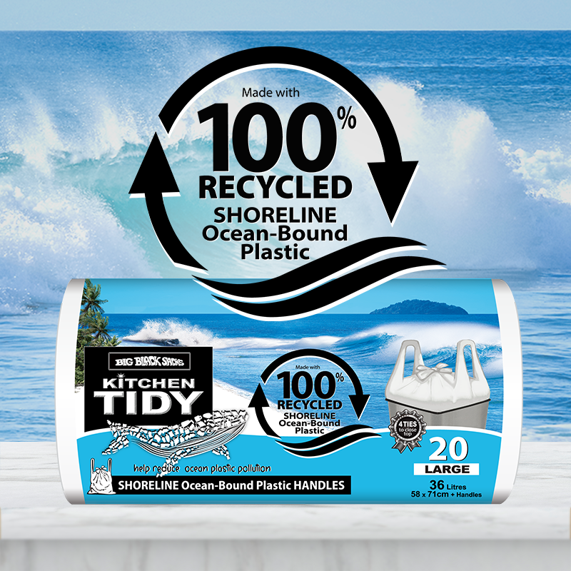 Big Black Sacks Tie-Top Kitchen bin liner sacks are made with 100% recycled Shoreline Ocean- Bound Plastic. This abandoned plastic waste is collected from the Shoreline environment located within 200m inland from the highest tide mark and 100m towards the sea from the lowest tide mark. Recycling Shoreline Ocean-Bound Plastic waste helps reduce plastic pollution from entering the Ocean and makes the seas safer for marine life.